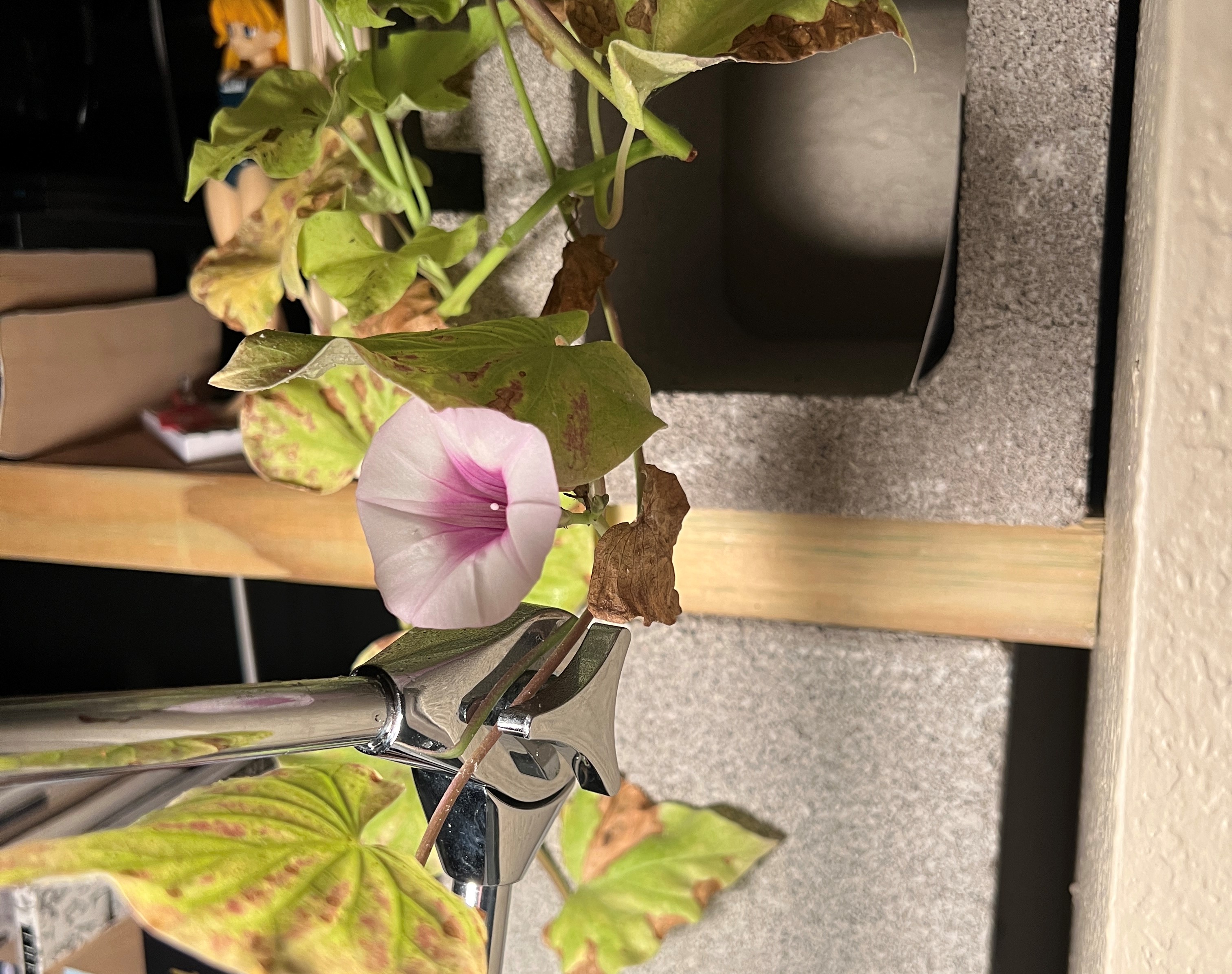 My vine grew a flower which I noticed yesterday; it is a pale pink on the open bell part and darker in the middle. I was very surprised to see it since it had never flowered before and it seems unhealthy. It constantly loses leaves and is covered in annoying little white insects that create sticky webs everywhere. Seeing the flower actually frightened me at first