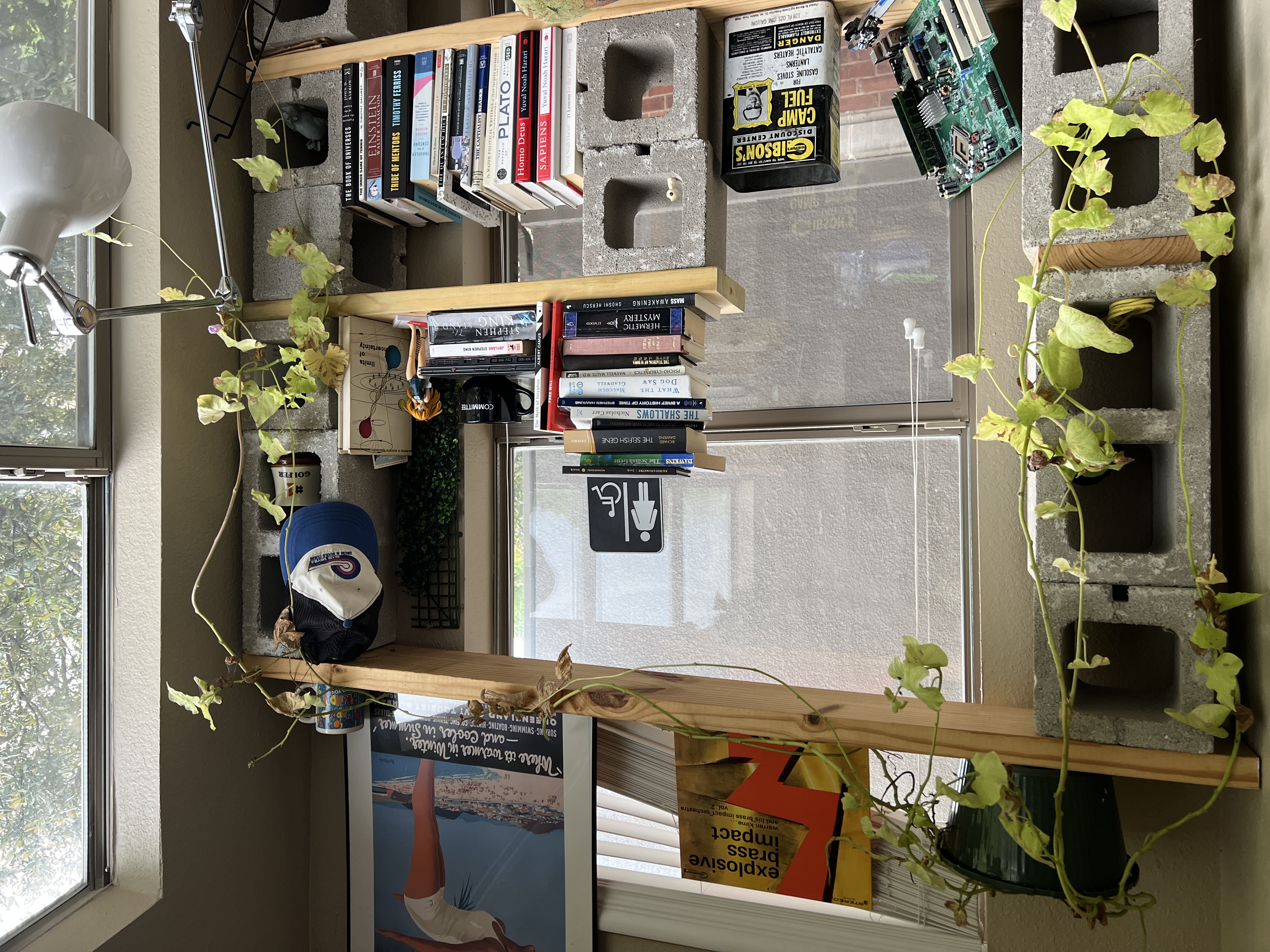 I was planning to throw the plant away when I move in June, but now the thought hurts my heart a little (if it isn't shallow to suddenly begin to love the thing once it becomes beautiful). I have always pitied that plant; it has a sickly, nasal tone and a persistent masochistic attitude which has been fruitless for months. but the flower says that it has hope for its future. it apparently recognizes the spring and wants to participate in the summer. so I can't throw it away, though it would benefit from some trimming and a new pot. It neatly frames a shelf whose genres are approximately anthropology and philosophy.