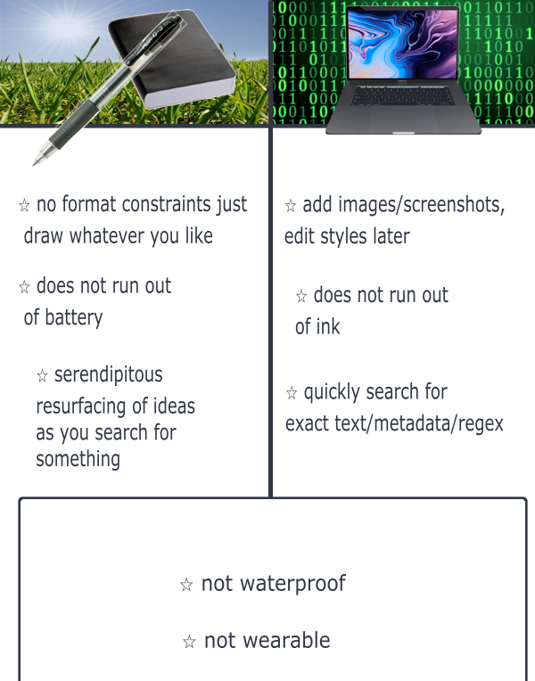 My second brain consists of a notebook and a black G2 0.38mm pen (impractical for running and showering). however, there are many options, like Apple Notes, Notion, and other Computer Applications. a bit of consideration has gone into the choice of format, as there are strong pros and cons...